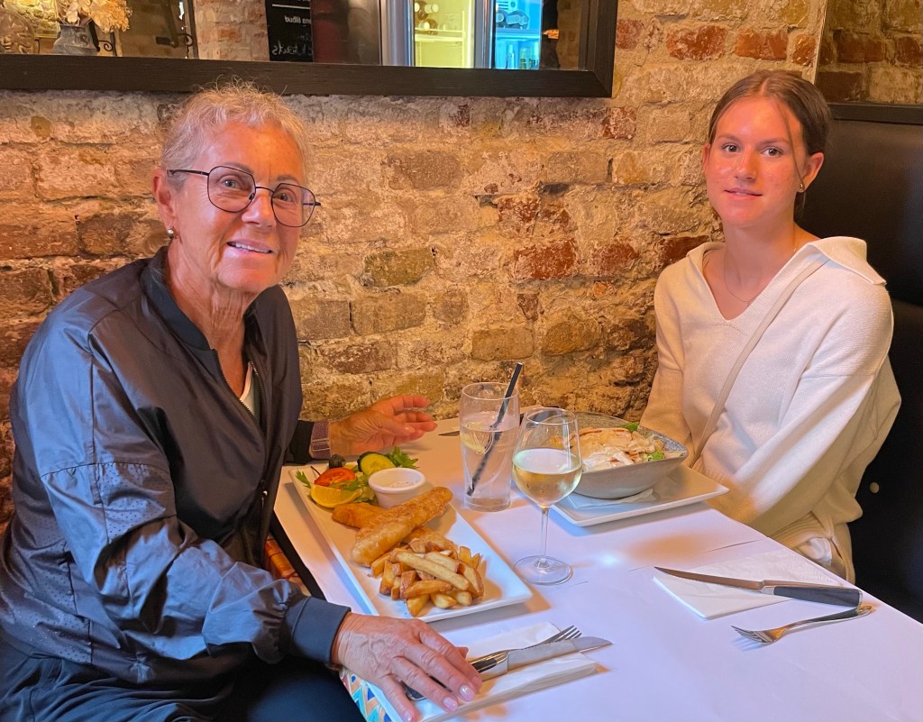 Middag första kvällen. Ebba äter Caesarsallad o jag äter fish’n chips.