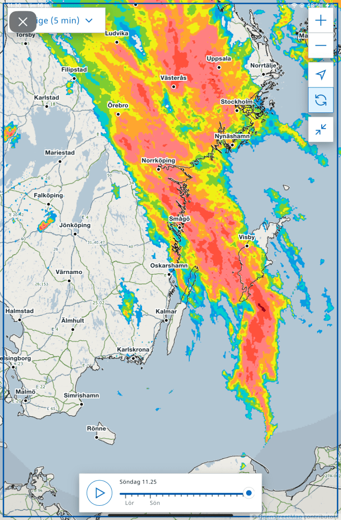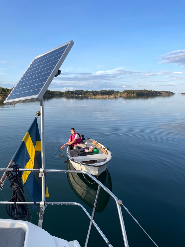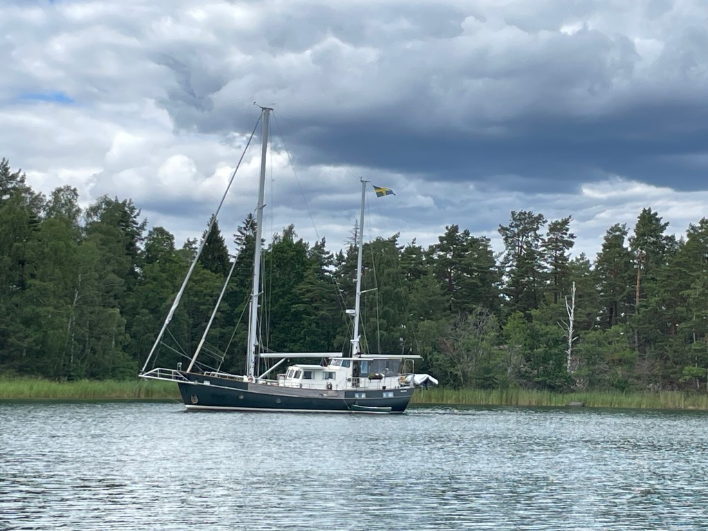 Inget regn i Espskärsleden även om de svarta regnmolnen hängde tungt in över land hela dagen. På Gupafjärden fick vi lite ökande vind då några små lågtryck letade sig för långt ut mot kusten. Jag skulle göra lunch till oss men det lutade stundtals så kraftigt så jag vågade inte öppna kylskåpsdörren och riskera att allting rasade ut. 😂