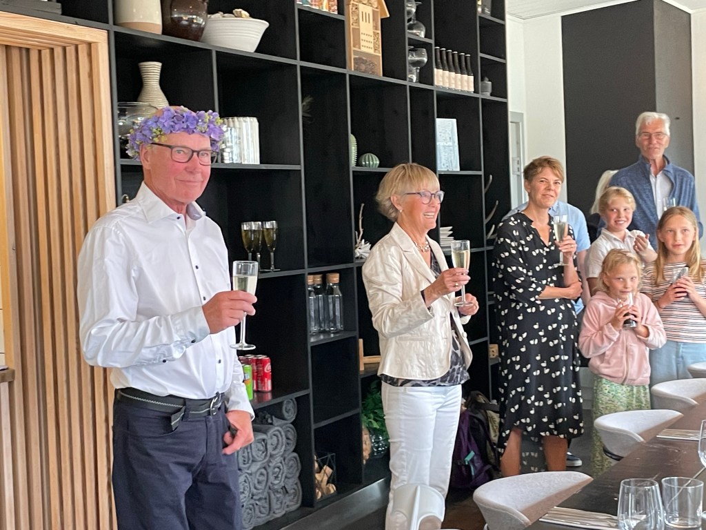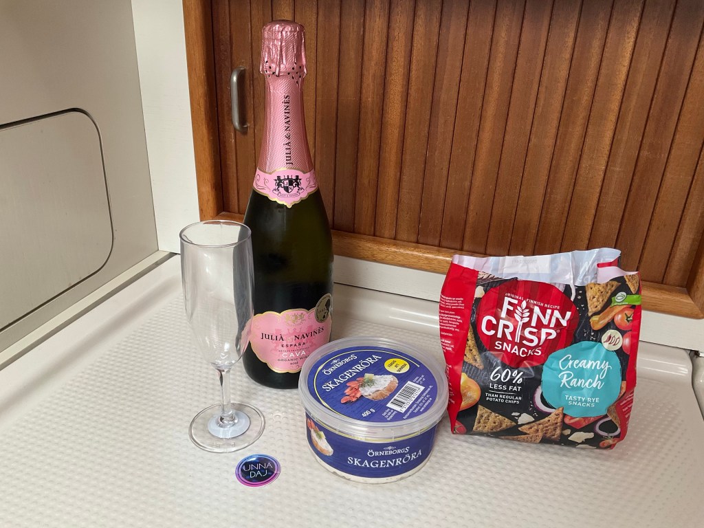Eve o Måns (o kanske några till) hade snickrat ihop ett perfekt midsommaraftonsprogram. Kl 13 var det sillunch och efter den tog dansen och lekarna kring midsommarstången, vid. Den traditionella tipspromenaden runt ön hängde vi naturligtvis med på. Innan middagen var det prisutdelning. Olle o jag kom 4:a på tipspromenaden. I samband med prisutdelningen blev jag till min stora förvåning och glädje uppvaktad av Eve med en flaska bubbel eftersom jag fyllt år. Eve är sååå omtänksam! 🥰