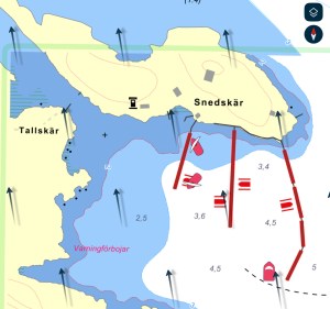 Så småningom dog vinden helt och till slut hade vi inget val – var tvungna att starta motorn för att ta oss över Bråviken. När vi var över och rundade upp mot Arkö så kom det lite seglingsbar vind – ca 3-4 sekundmeter. Vi tog dock ner seglena och gick mot Snedskär där vi hittade varsin bra bryggplats. Efter ca 30 minuter anslöt Lena o Anders via inre leden.