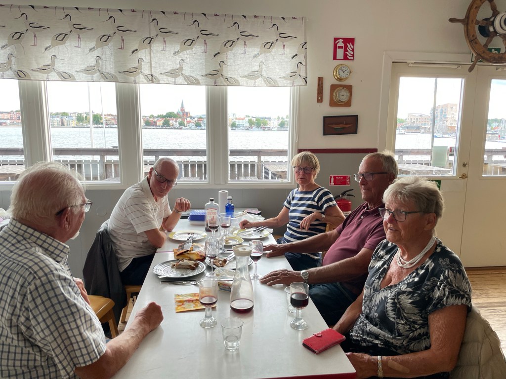 Även vi två besättningar som är kvar, behöver föda och intar den i ”ensamt majestät” vid ”fönsterbord” medan den nedåtgående solen värmer oss i mesta laget – nästan så att svettdroppar genereras i pannan…