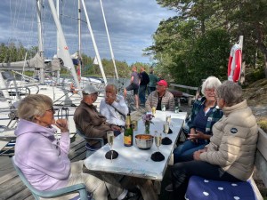 Vi låg kvar under helgen eftersom vindarna var gynnsamma och många vänner anlände. Det blev kvällar med sång, dans och härligt umgänge.