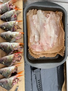 Vi var flera som fiskade och alla fick napp! Själv drog jag upp 4 rejäla abborrar. Plussade på med 4 till från fiskande vänner (som inte äter fisk). Efter att ha sett på Youtube-klipp hur man rensar, filéar och byxar abborrar så satte jag igång. Det tog några timmar…. Lärde mig dessutom att getingar gillar fisk. De blev väldigt närgångna kan jag säga. Mycket nöjd med filéerna sköljde jag av dem i färskvatten inne i båten innan de fick vila i kylen tills det var dags att anrätta dem.