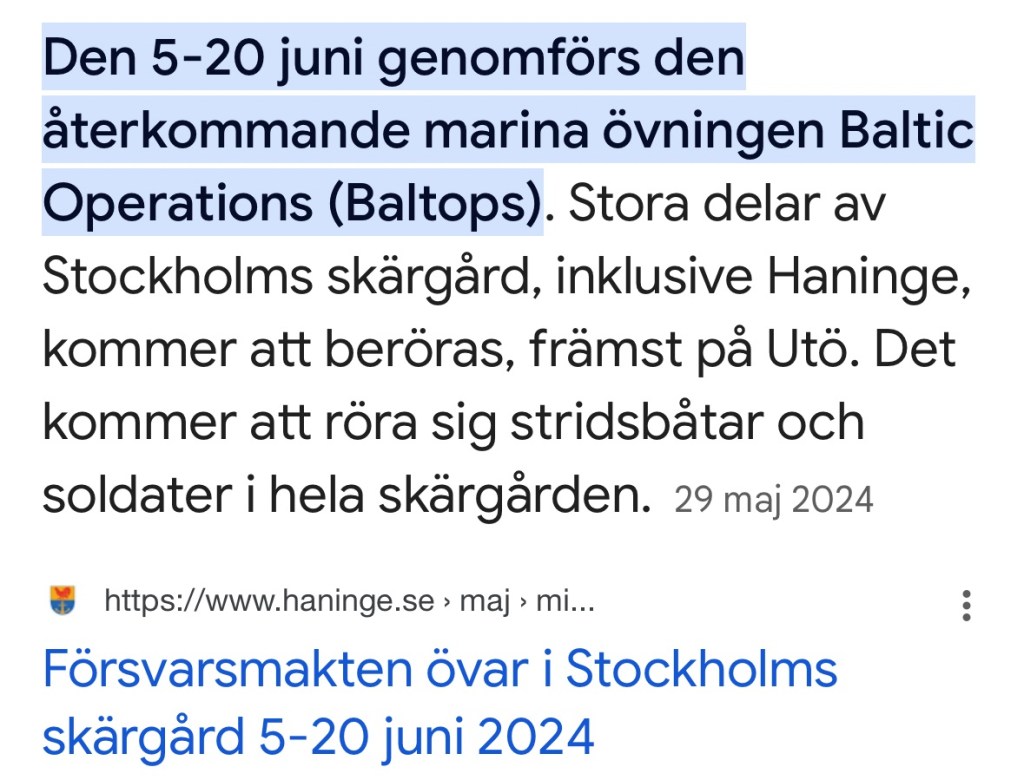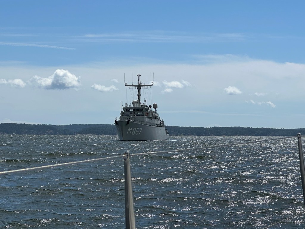 På vår färd söderut så har vi mött flera militära fartyg som sakta tar sig inåt i Södertälje-leden. Det hör inte till vanligheterna men det pågår övningar i ”vår” skärgård. Vi vinkar glatt till besättningen som glatt vinkar tillbaka.
