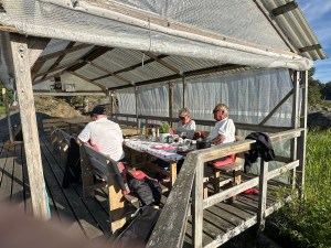 Kvällen bjöd på solsken och vi tog plats på det stängda bageriets veranda för gemensam middag.