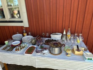 Regnskurar lite då o då gjorde att vi åt under sittbrunnstält hos de som hade ”orkat” sätta upp dem….! Kerstin o Barbro bjöd på förrätt och vår huvudrätt, grillade revbensspjäll, smakade så himla gott!